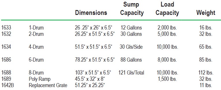 All spill platforms are made from chemical resistant polyethylene for superior strength and durability. All platforms are low profile for easy access and are compatible with ramp #1689. Heavy duty grating removes easily for cleaning. The 6-Drum & 8-Drum platforms meet EPA requirement 40 CFR 264.175